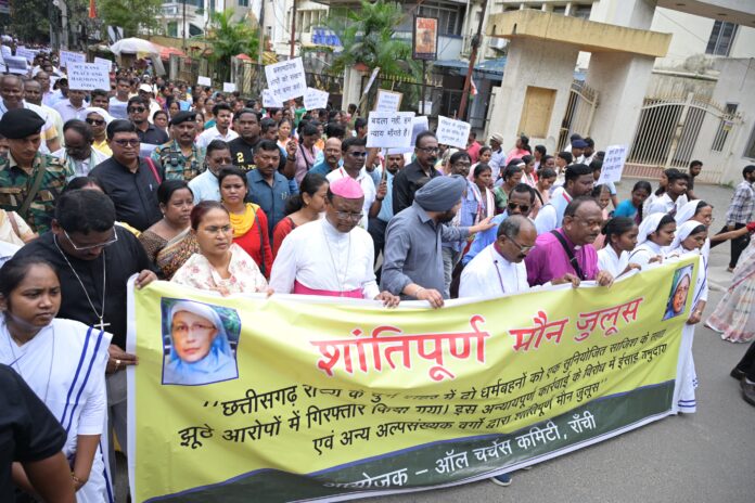 रांची : ऑल चर्चेज कमिटी, रांची के द्वारा छत्तीसगढ़ में दो धर्म बहनों के साथ घटित घटना के विरोध में रविवार को शांतिपूर्ण मौन जुलूस निकाला गया. इस जुलूस में राज्य की कृषि, पशुपालन एवं सहकारिता मंत्री शिल्पी नेहा तिर्की भी शामिल हुई.