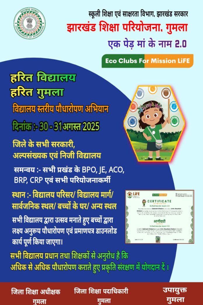 गुमला, 30 अगस्त। झारखंड शिक्षा परियोजना गुमला द्वारा “मिशन लाइफ” के तहत जिलेभर में “एक पेड़ माँ के नाम” विशेष पौधारोपण अभियान चलाया जा रहा है। इस पहल को “हरित विद्यालय – हरित गुमला” नाम दिया गया है और यह अभियान 31 अगस्त तक जारी रहेगा।