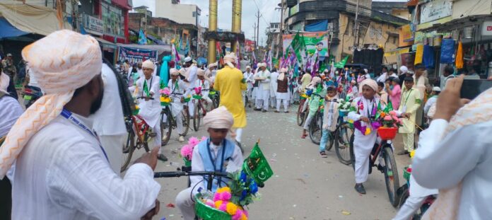 गुमला, 5 सितम्बर – अंजुमन इस्लामिया गुमला के बैनर तले मंगलवार को शहर में ईद मिलादुन्नबी का जुलूस पूरे अकीदत और एहतेराम के साथ निकाला गया। जुलूस में हजारों की संख्या में लोग शामिल हुए और नबी-ए-करीम हजरत मोहम्मद सल्लल्लाहो तआला अलैहि वसल्लम के पैगाम-ए-इंसानियत को याद किया गया।