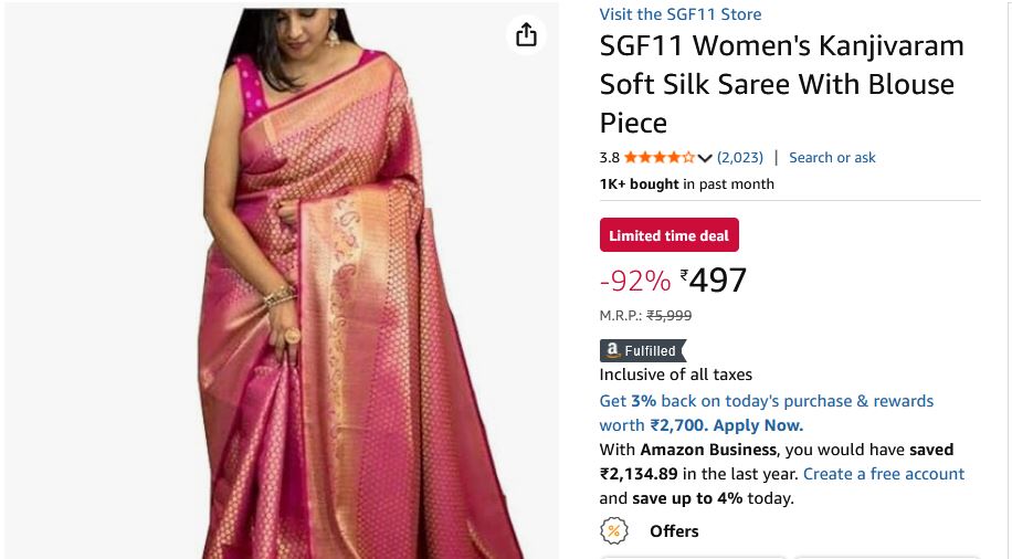 ₹499.00 (as of March 6, 2026 18:04 GMT +05:30 - More infoProduct prices and availability are accurate as of the date/time indicated and are subject to change. Any price and availability information displayed on [relevant Amazon Site(s), as applicable] at the time of purchase will apply to the purchase of this product.)SGF11 Women's Kanjivaram Soft Lichi Silk Saree With Blouse Piece