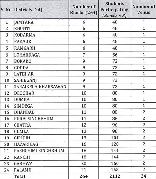 राज्यभर के विभिन्न प्रखंडों से चयनित कक्षा 9 से 12 तक के कुल 2,112 छात्र-छात्राएं इस प्रतियोगिता में हिस्सा लेंगे। जिलास्तर पर उत्कृष्ट प्रदर्शन करने वाले विद्यार्थियों को राज्यस्तरीय प्रतियोगिता में भाग लेने का अवसर मिलेगा।