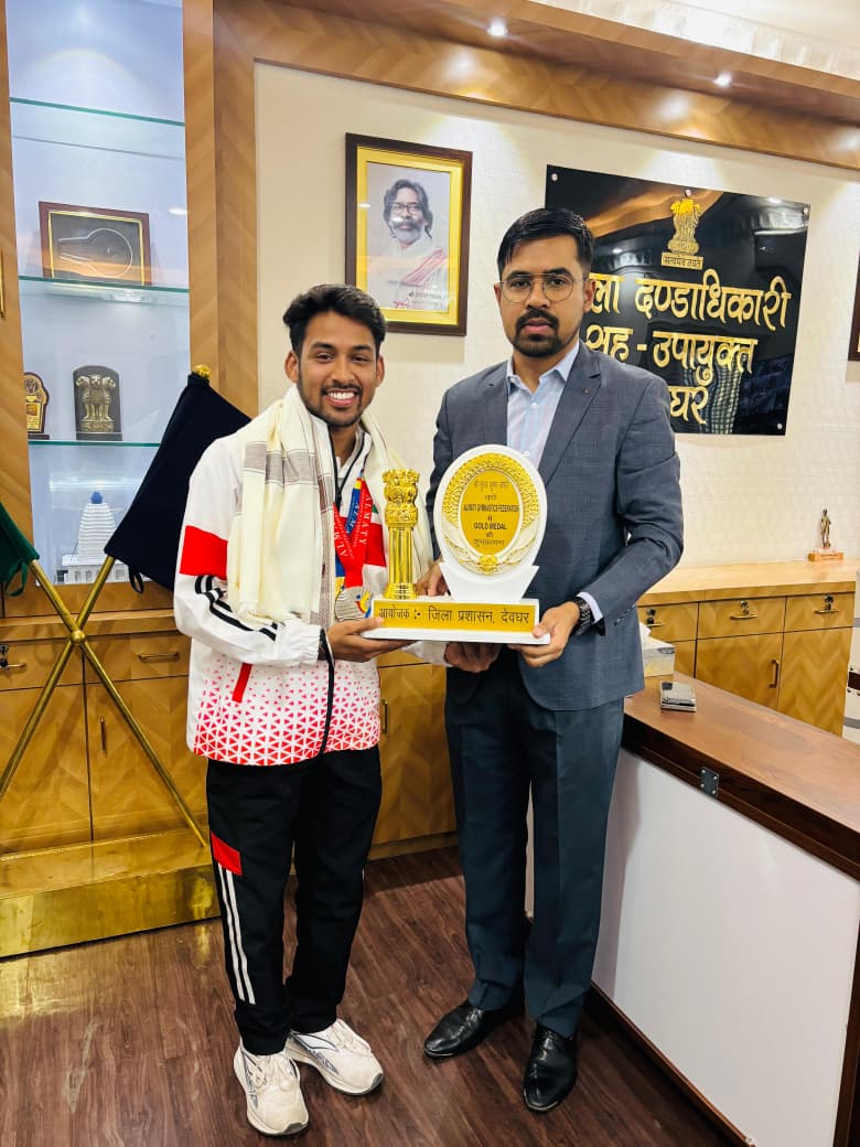 देवघर : उपायुक्त सह जिला दंडाधिकारी नमन प्रियेश लकड़ा ने बुधवार को अंतर्राष्ट्रीय एरोबिक्स जिम्नास्टिक चैंपियनशिप, अल्माटी कप 2025-26 में स्वर्ण पदक विजेता सूरज कुमार केशरी को सम्मानित करते हुए उज्ज्वल भविष्य की शुभकामनाएं दी।