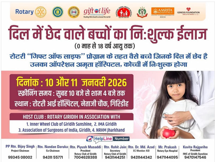 गिरिडीह। रोटरी क्लब गिरिडीह ने झारखंड के उन बच्चों के लिए एक बड़ी पहल की है जो जन्मजात हृदय रोग या दिल में छेद जैसी गंभीर बीमारियों से पीड़ित हैं और आर्थिक रूप से सक्षम नहीं होने के कारण बड़े शहरों में उपचार नहीं करा पाते।