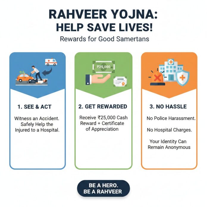 • नकद इनाम: गंभीर रूप से घायल व्यक्ति को अस्पताल पहुँचाने वाले व्यक्ति को प्रति केस ₹25,000 दिए जाएंगे।