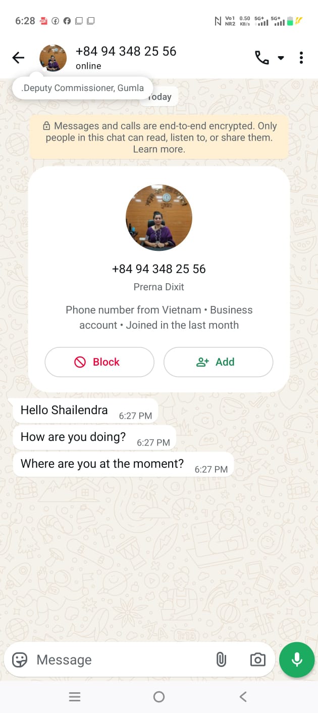 गुमला : आमजनों को सूचित किया जाता है कि उपायुक्त गुमला, श्रीमती प्रेरणा दीक्षित के नाम से एक फर्जी/अनधिकृत व्हाट्सएप अकाउंट सक्रिय होने की सूचना प्राप्त हुई है। संबंधित फर्जी अकाउंट/नंबर (+84943482556) से लोगों को कॉल या संदेश भेजकर भ्रमित किए जा रहे हैं।
