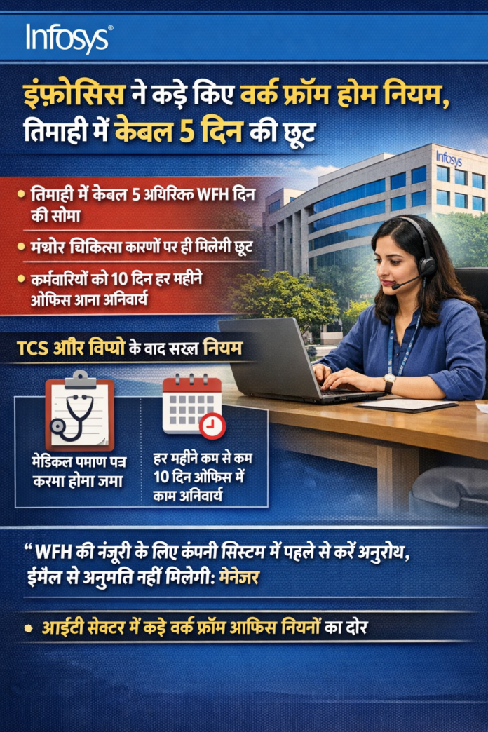 बेंगलुरु। देश की प्रमुख आईटी कंपनी इंफोसिस ने वर्क फ्रॉम होम (WFH) नीति को और सख्त करते हुए वर्क फ्रॉम ऑफिस (WFO) से छूट पर नई सीमा तय कर दी है। कंपनी ने तिमाही आधार पर अतिरिक्त WFH दिनों की संख्या अधिकतम पांच दिन तक सीमित कर दी है। यह फैसला टाटा कंसल्टेंसी सर्विसेज (TCS) और विप्रो द्वारा हाल के महीनों में अपनाई गई सख्त नीतियों के बाद लिया गया है।