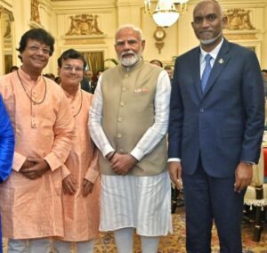 दिल्ली स्थित हैदराबाद हाउस (2025) में मंच पर प्रस्तुति के बाद प्रधानमंत्री नरेंद मोदी और मालद्वीप के राष्ट्रपति मो.मोइज्जू गिरिडीह के केडिया बंधुओं मोर मुकुट और मनोज केडिया (गुलाबी परिधान में दोनों भाई) के साथ.