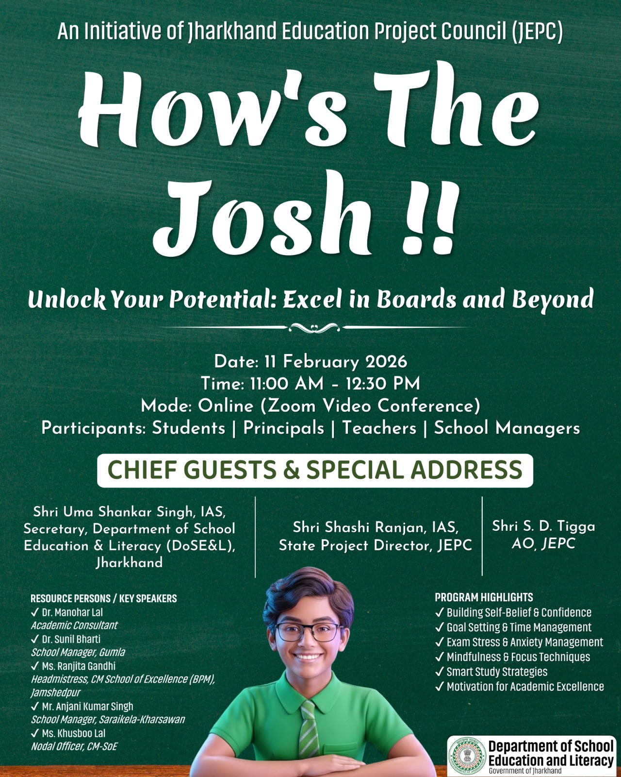 राज्य में संचालित सीएम स्कूल ऑफ़ एक्सीलेंस में बोर्ड परीक्षा 2026 की तैयारी कर रहे कक्षा 10वीं एवं 12वीं के विद्यार्थियों को मानसिक रूप से सशक्त और आत्मविश्वासी बनाने के उद्देश्य से झारखंड शिक्षा परियोजना परिषद द्वारा “HOW’S THE JOSH!! – Unlock Your Potential: Excel in Boards and Beyond” शीर्षक से एक विशेष ऑनलाइन मोटिवेशनल कार्यक्रम का आयोजन दिनांक 11 फरवरी 2026 को किया जाएगा। यह डेढ़ घंटे का ऑनलाइन कार्यक्रम राज्य के सभी 80 सीएम स्कूल ऑफ एक्सीलेंस (SoEs) सहित अन्य विद्यालयों के विद्यार्थियों एवं शिक्षकों के लिए आयोजित किया जा रहा है। कार्यक्रम का उद्देश्य बोर्ड परीक्षा से पहले छात्रों में आत्मविश्वास जगाना, परीक्षा से जुड़े तनाव को कम करना तथा प्रभावी तैयारी के लिए व्यावहारिक रणनीतियाँ साझा करना है।