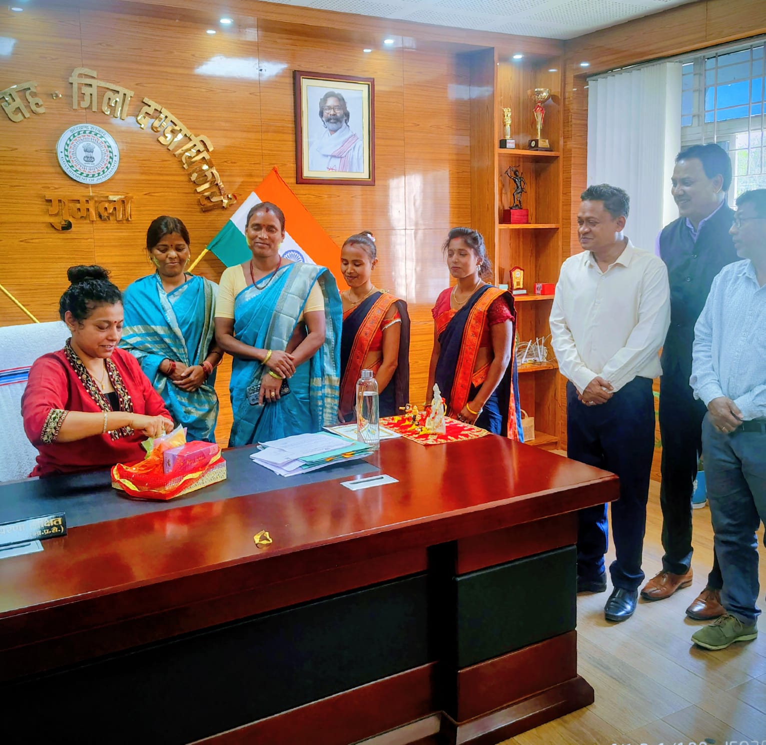 गुमला : – गुमला उपायुक्त प्रेरणा दीक्षित के कार्यालय कक्ष गुमला में रंगों के पावन त्यौहार होली के अवसर पर आज शुक्रवार को पलाश–जेएसएलपीएस द्वारा गठित आदर्श स्वयं सहायता समूह, तर्री, फसिया की दीदियों द्वारा तैयार हर्बल लाल – गुलाल को उपायुक्त गुमला प्रेरणा दीक्षित को भेंट करते डॉ हुए इसका विधिवत शुभारंभ किया गया। इस अवसर पर उपायुक्त ने सखी मंडलों की दीदियों को हर्बल गुलाल लगाकर होली पर्व की अग्रिम बधाई एंव शुभकामनाएं दीं।